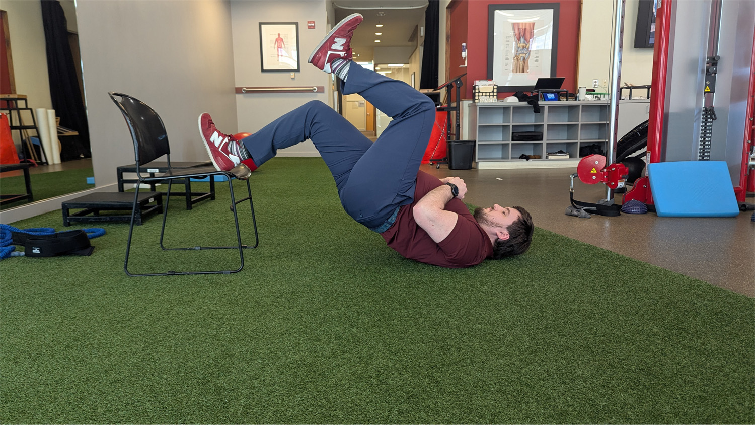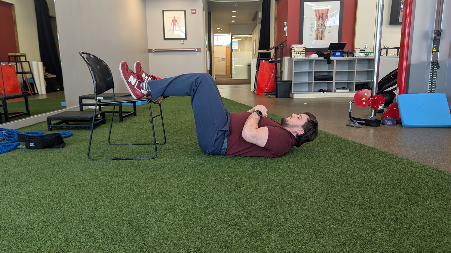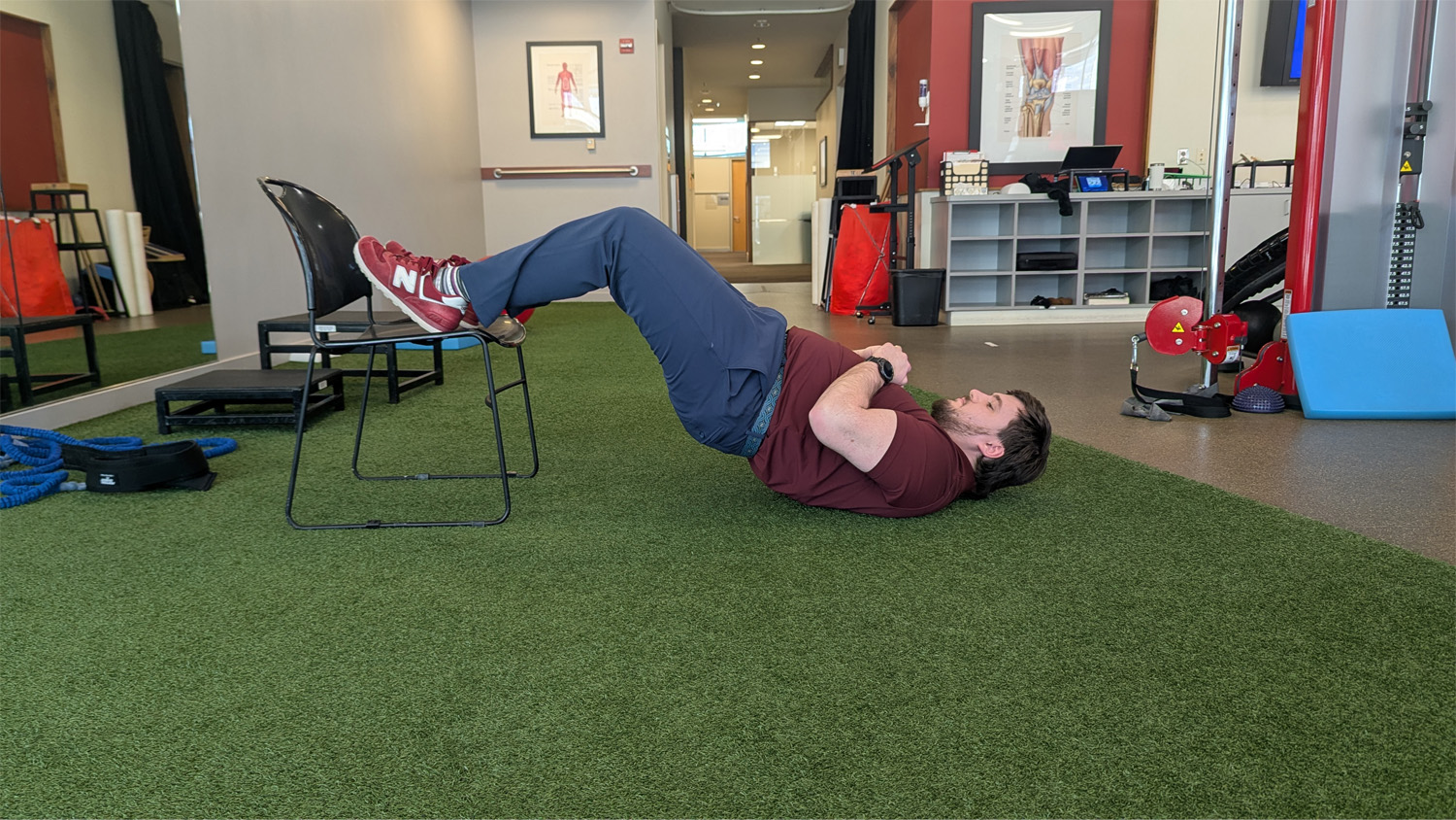 - Feet-elevated bridges (single-leg or double-leg): Lie on the back with the feet placed on a chair or ledge so the knees are bent to roughly 90°. Squeeze the glutes and hamstrings to lift the hips off the ground. Slowly lower back down to the starting position, taking longer to lower than to lift.
