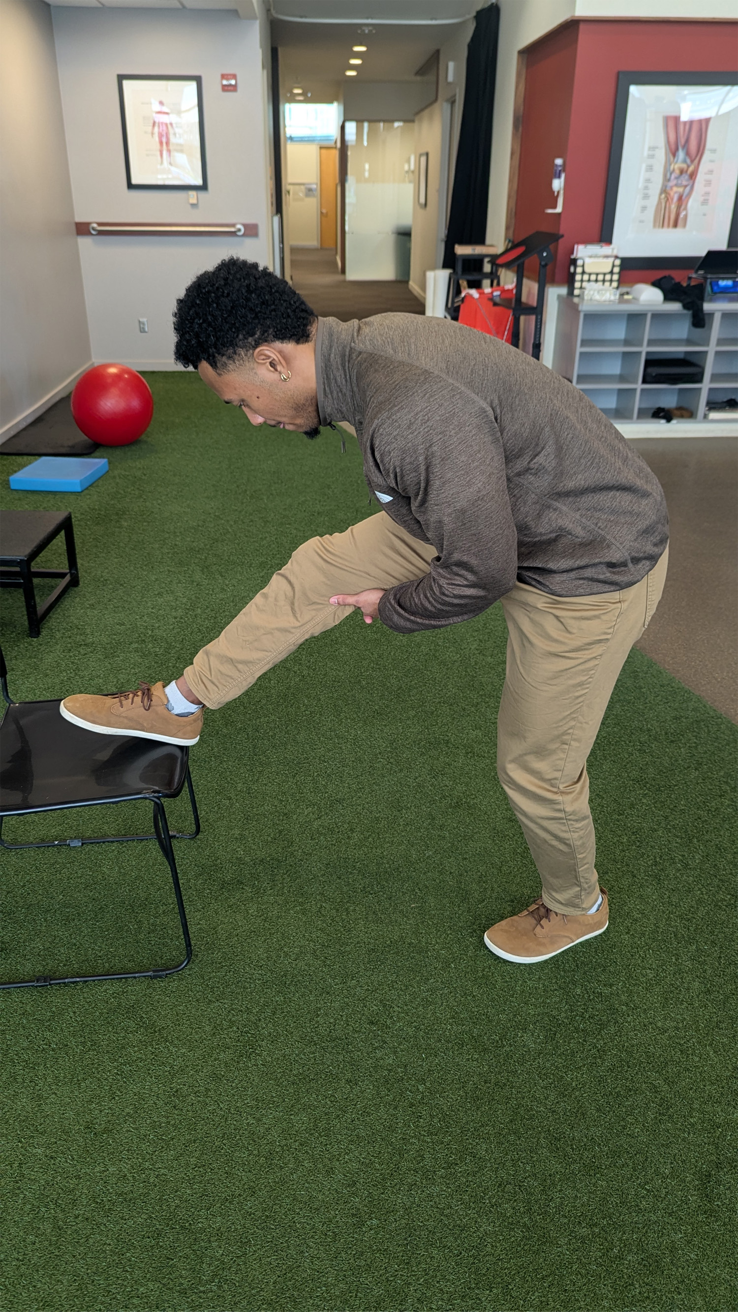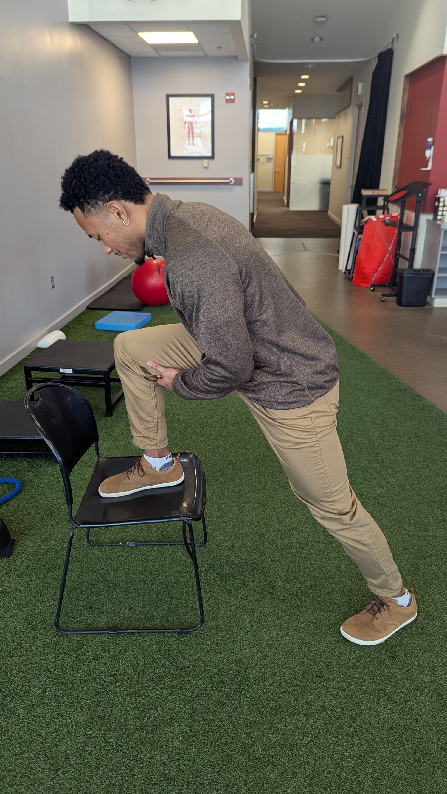 - Runner’s hamstring stretch (static stretch): Place one leg on a chair or platform with the knee bent. Bring the chest down toward the leg while keeping the knee bent. Then gently straighten the leg while keeping the chest down until a stretch is felt in the hamstring. Hold for 30 – 40 seconds and repeat 3 times.