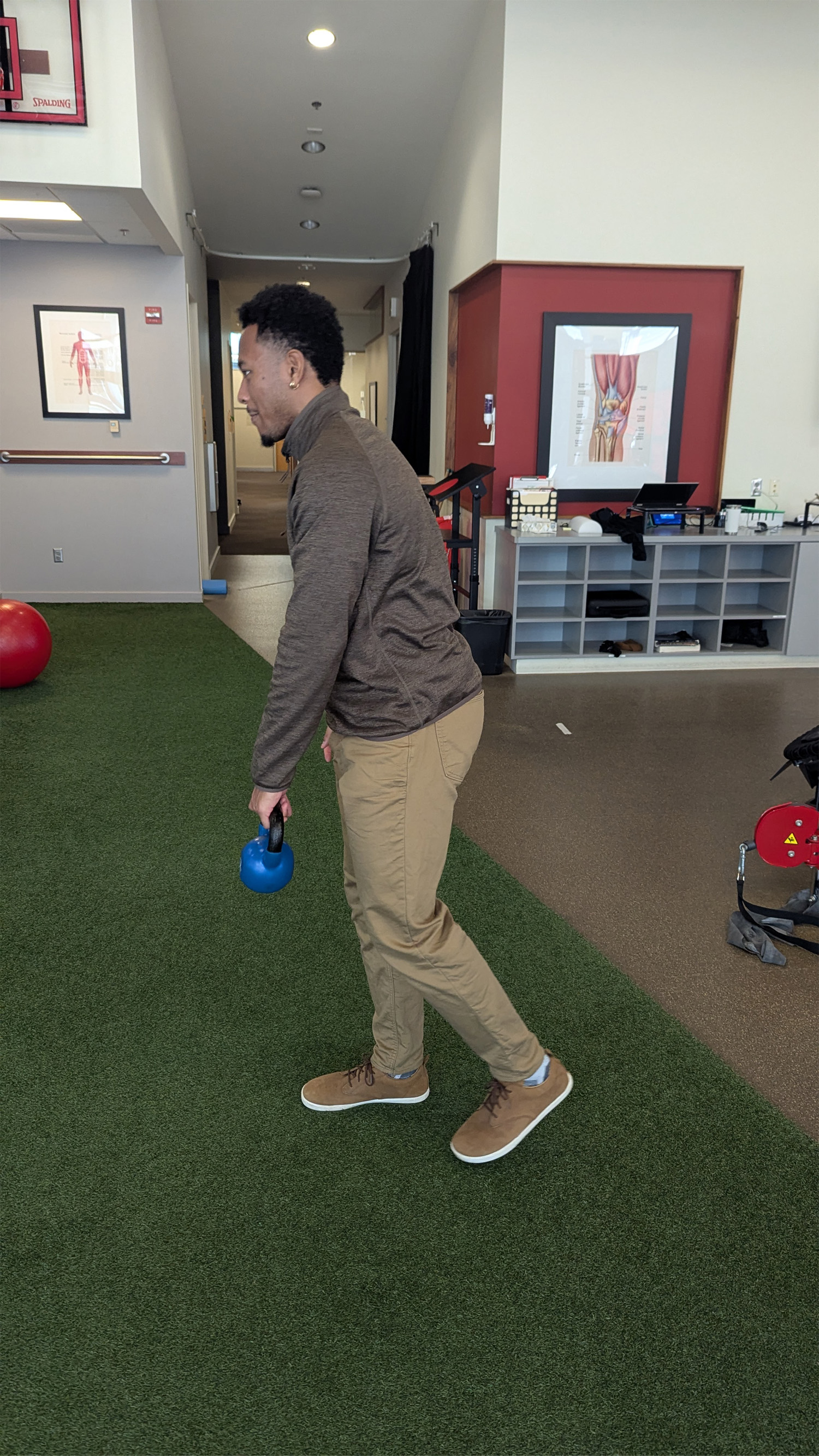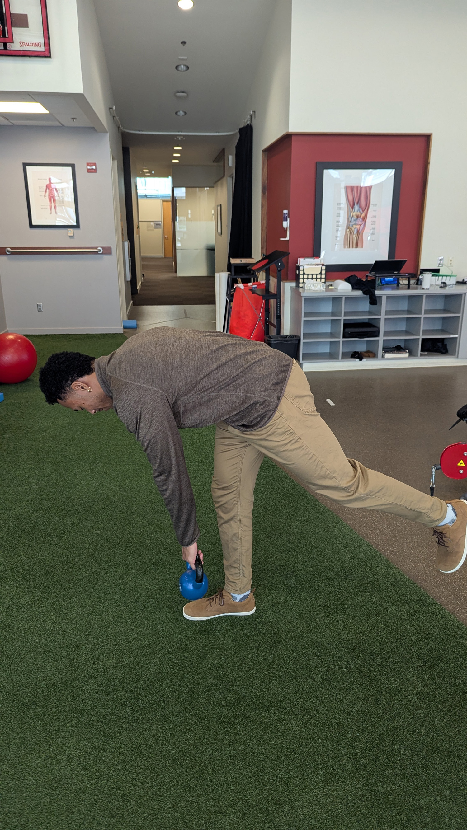 - Single-leg Romanian deadlift: Start in a single-leg balanced position. Push the hips back and hinge forward to reach toward the standing leg. Keep the hands close to the leg throughout the movement, avoiding reaching farther away than the toes. At the bottom of the movement, squeeze the glutes and pull the hips forward to return to the starting position. This exercise can be performed with or without weighted resistance.