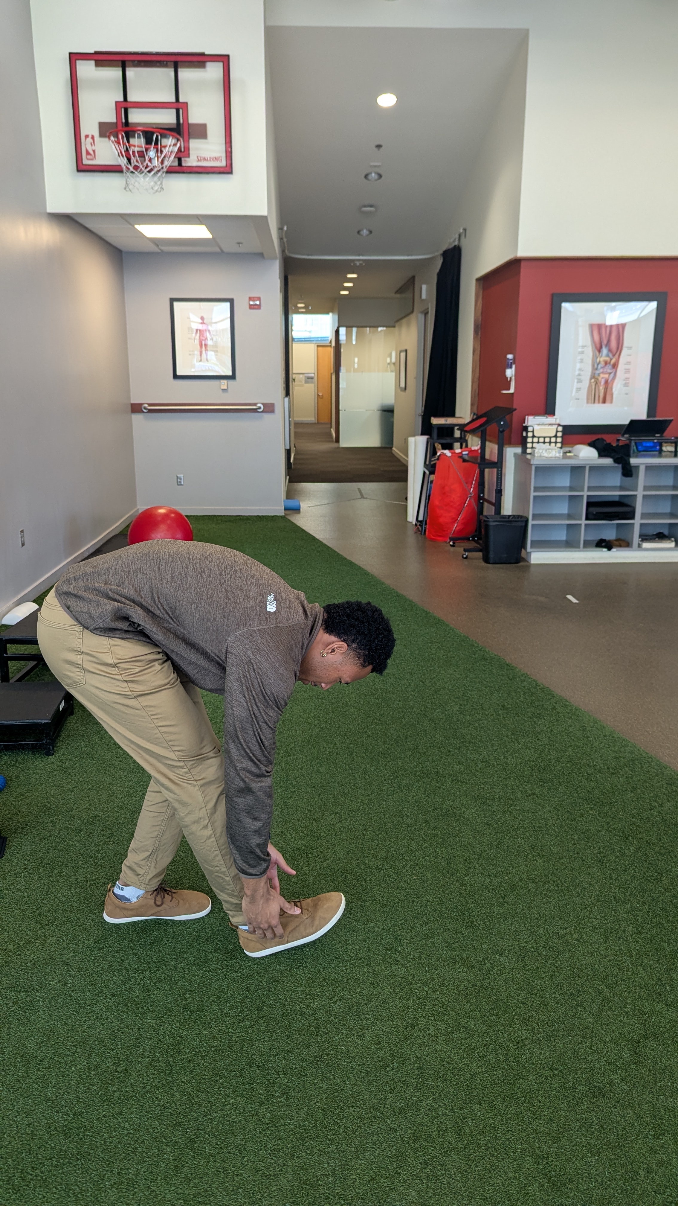 - Hamstring scoop walks (dynamic stretch): Place one foot out in front, then reach down and “scoop” the arms forward while stepping through before returning to an upright position. Repeat 7 – 10 times on each side.